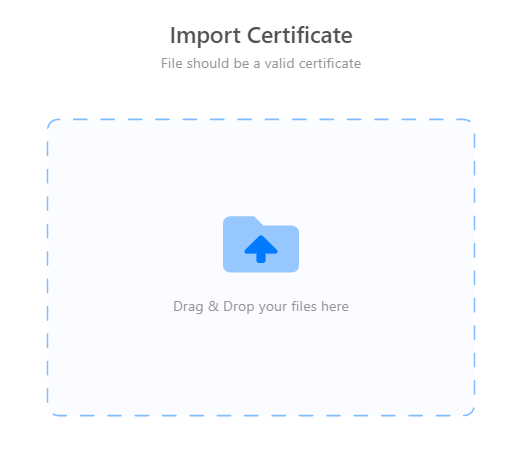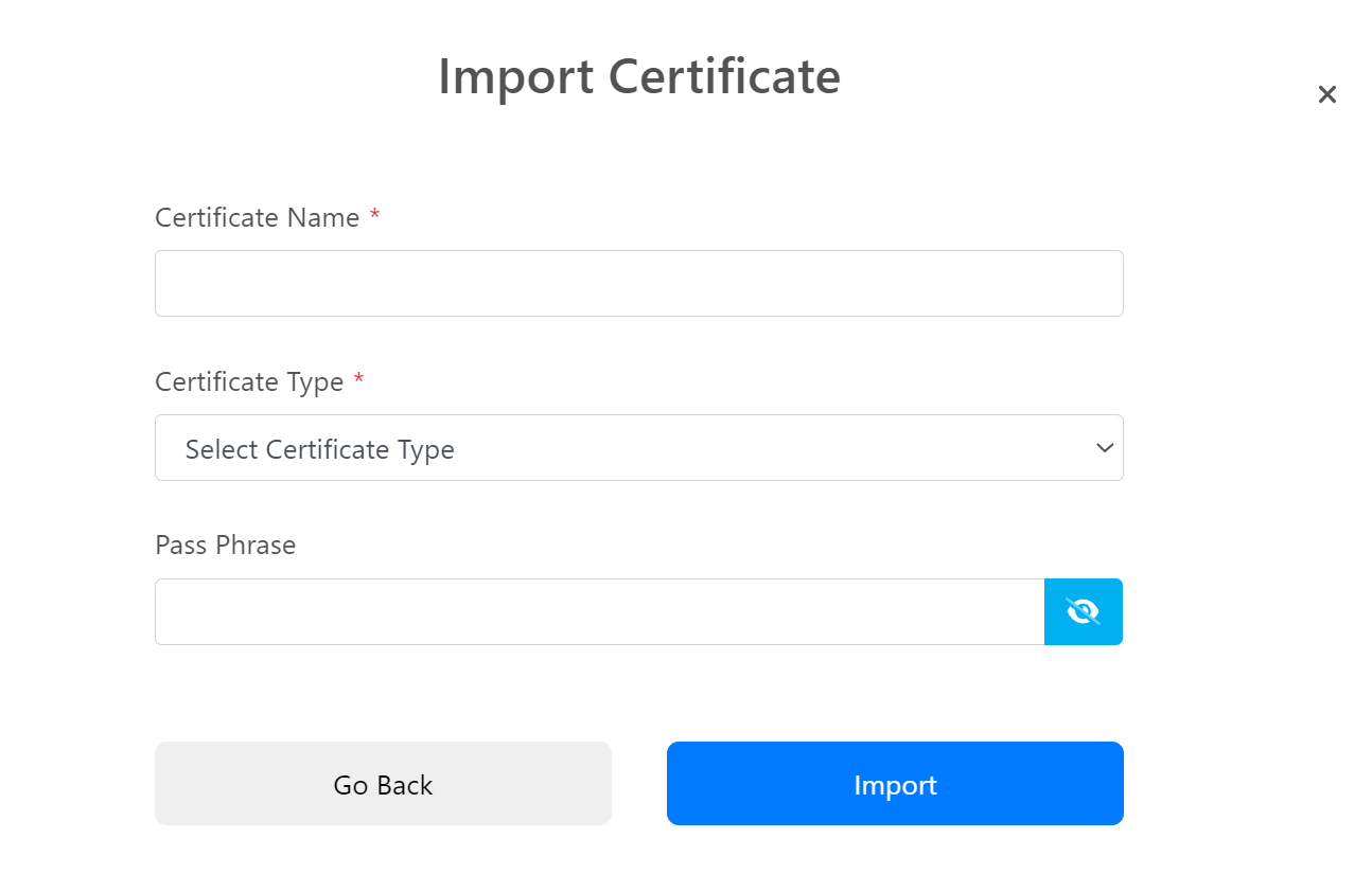 3. Name the Certificate, choose the Certificate type, supply a Pass Phrase and click Import.