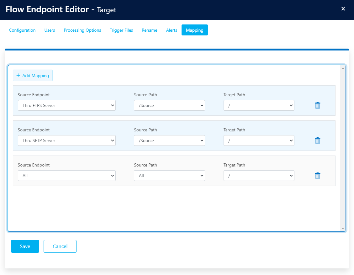 Click the Actions icon next to your Thru FTPS endpoint. Select Edit Flow Endpoint Settings. Click the Mapping tab.