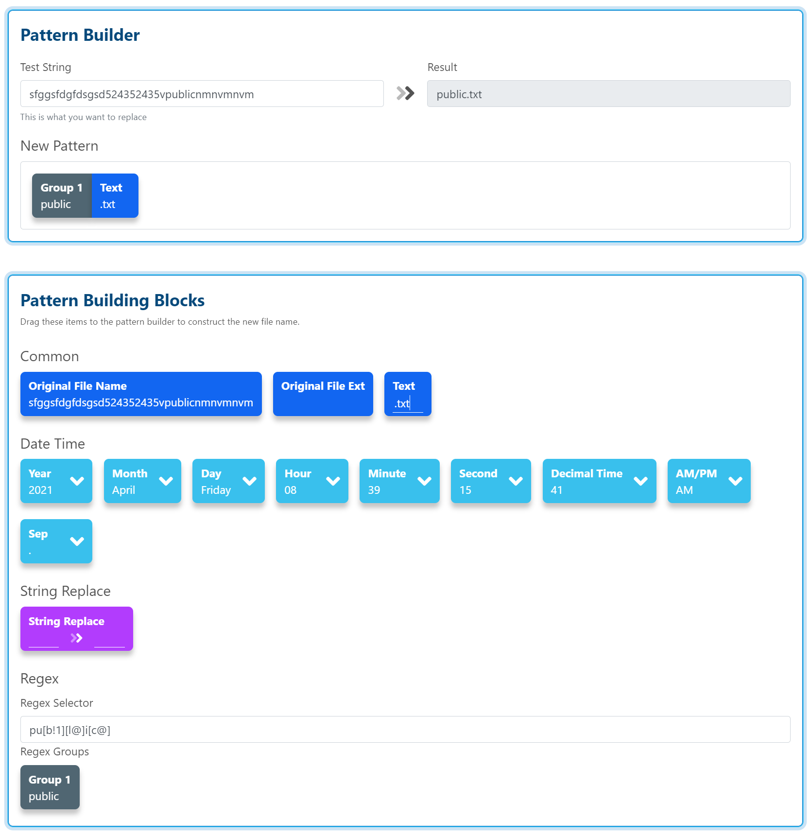 5. In the New Pattern field, drag and drop common rename building blocks to create a rename structure. The Result field will show what the new file would be.