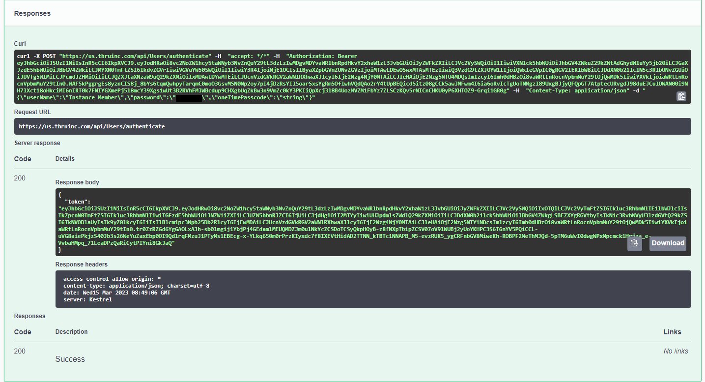 For example the response body provided is: "token": "eyJhbGciOiJSUzI1NiIsInR5cCI6IkpXVCJ9.eyJodHRwOi8vc2NoZW1hcy5taWNyb3NvZnQuY29tL3dzLzIwMDgvMDYvaWRlbnRpdHkvY2xhaW1zL3JvbGUiOiJyZWFkZXIiLCJVc2VySWQiOiIxNDQiLCJVc2VyTmFtZSI6Ik1hdHRoZXdDU1RocnUiLCJGaXJzdE5hbWUiOiJNYXR0aGV3IiwiTGFzdE5hbWUiOiJMb2ZsaW4iLCJUZW5hbnRJZCI6IjY1IiwiY3R4IjoiNTk5NiIsIlByaXZpbGVnZUNvZGVzIjoiMTAwLDEwOSwxMTAsMTEzIiwiQ3VzdG9tZXJOYW1lIjoiQ1MgVGhydSAiLCJDdXN0b21lclN5c3RlbUNvZGUiOiJDVVZORkciLCJPcmdJZHMiOiIiLCJQZXJtaXNzaW9uQ29kZXMiOiIxMDAwLDYwMTEiLCJUcnVzdGVkRGV2aWNlRXhwaXJlcyI6IjE2Nzg4MjM5NDQiLCJleHAiOjE2Nzg5MTAzNDQsImlzcyI6Imh0dHBzOi8vaWRtLnRocnVpbmMuY29tOjQwMDk5IiwiYXVkIjoiaWRtLnRocnVpbmMuY29tIn0.Rdia1AXVhxPu0blIlyctZI0lcNVmPSdRsi6PjY3BjdMIvVDLmDm9SD2kDLUJ3LNGu2Cy5jwrEdIvDc6tsPLEiyWWcMhaeCaN9vwxsY0dsJ1kPWtBMDQMGqpeVA9iuSbxxcMGGuJk7hpmZxzQc5naZ4LB9Xcvb_bGBqs4XJFaUzrqKj4FecVR6PH-pwlACESkcA9ew5U8uYyaLNNL-Bn265JVsioxIC5btAHkwc2adivkJf4G8GOx4stC_elC3FseSJ8eo7EgKcLXfe2klKbi0goEm1kpJ2s8DjjmtyG5pE8P9Vsb_Pj2FmURqnFYyJO_2wlSMxCTrYZ96l71lu--ww"