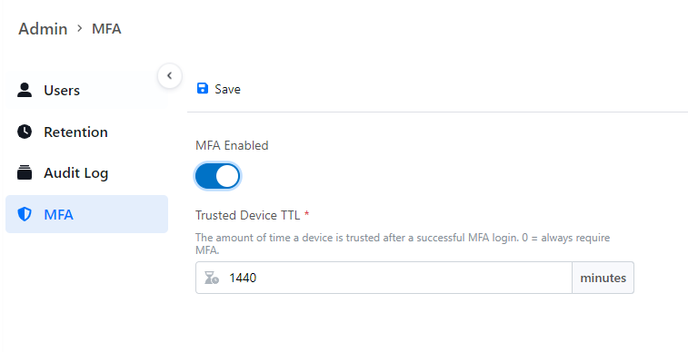 Trusted Device TTL * - This refers to the duration for which a device remains trusted following a successful Multi-Factor Authentication (MFA) login. A value of 0 indicates that MFA will always be required for access.