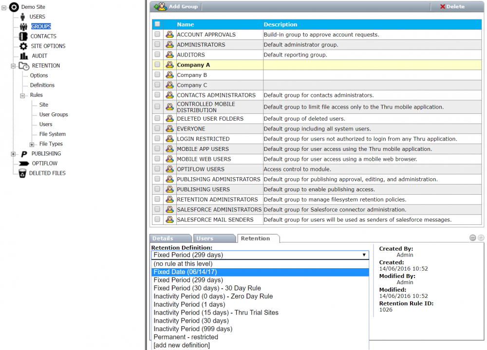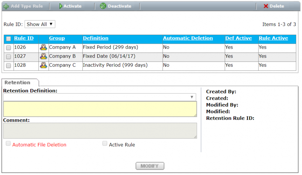 To create a new rule, navigate to the group from Administration > Groups, click the Retention tab, and then on the Modify button. Select a definition from the drop-down or add a new definition by selecting a new definition at the bottom of the definition list. By default, the rule is in an active state and automatic deletion is turned off.