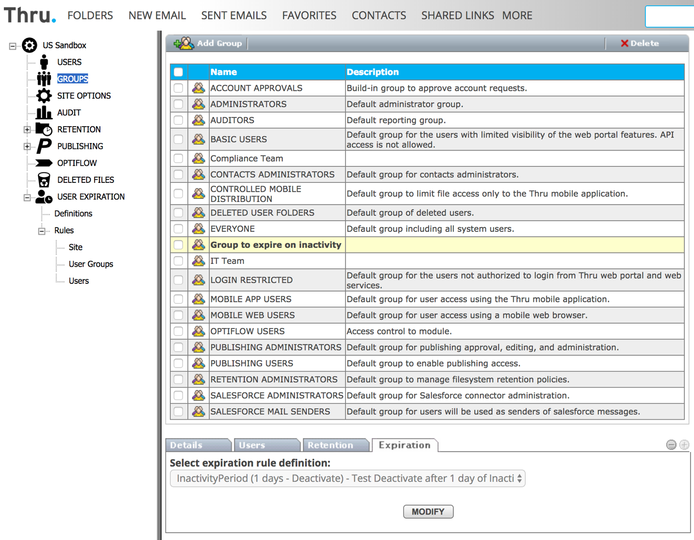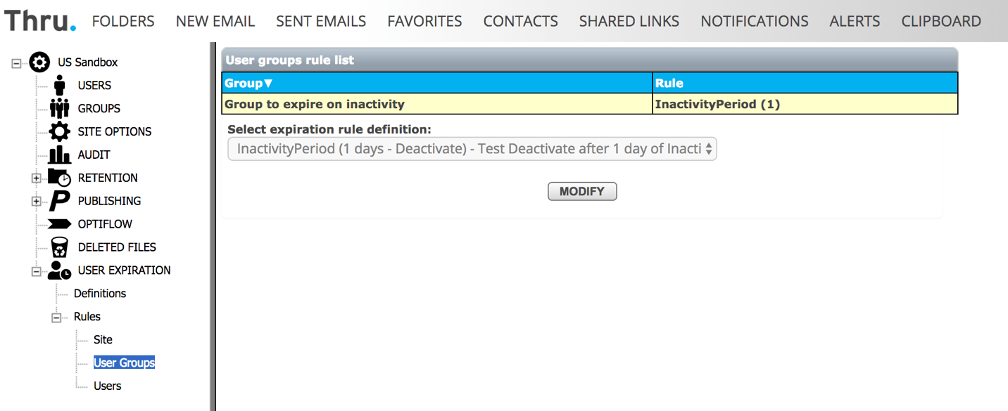 User Group rules are listed under Administration->User Expiration->Rules->User Groups where administrators can view and manage the rules: