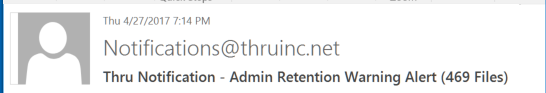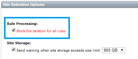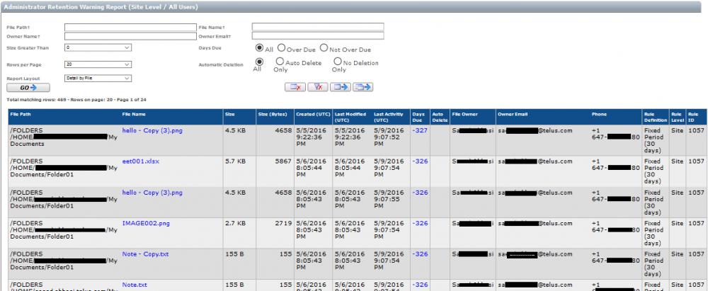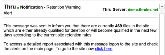 In our example, the email message reports that the retention system will delete 469 files in the site as a result of the new site rule definition.