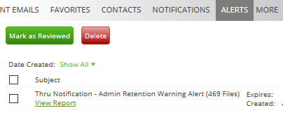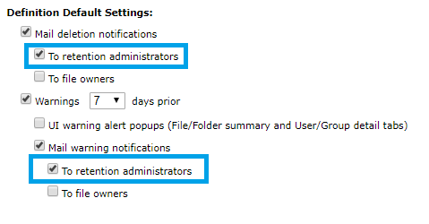Ensure that the settings for Definition Default Settings are set to send all notifications to the retention administrators.