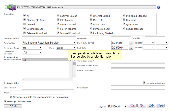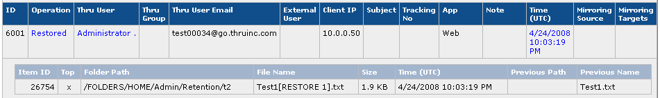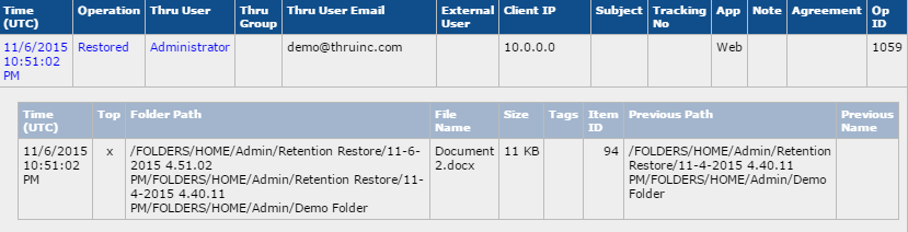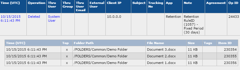 Following is an example of a deleted item with related retention rule information in the Audit manager Transaction Log report. You can search for a rule number using the “Logging Note” filter.