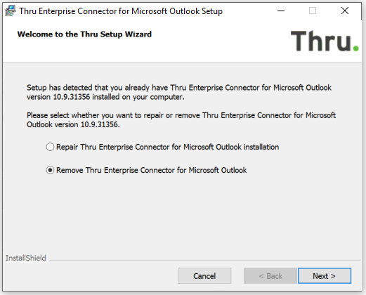 Thru Installer – Using the same Thru-provided installation application for removal, run the setup.exe file again but this time choose the Remove option and follow the on-screen prompts.
