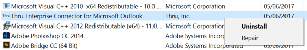 Windows Start > Control Panel > Programs (Uninstall a Program) > Thru Enterprise Connector for Microsoft Outlook