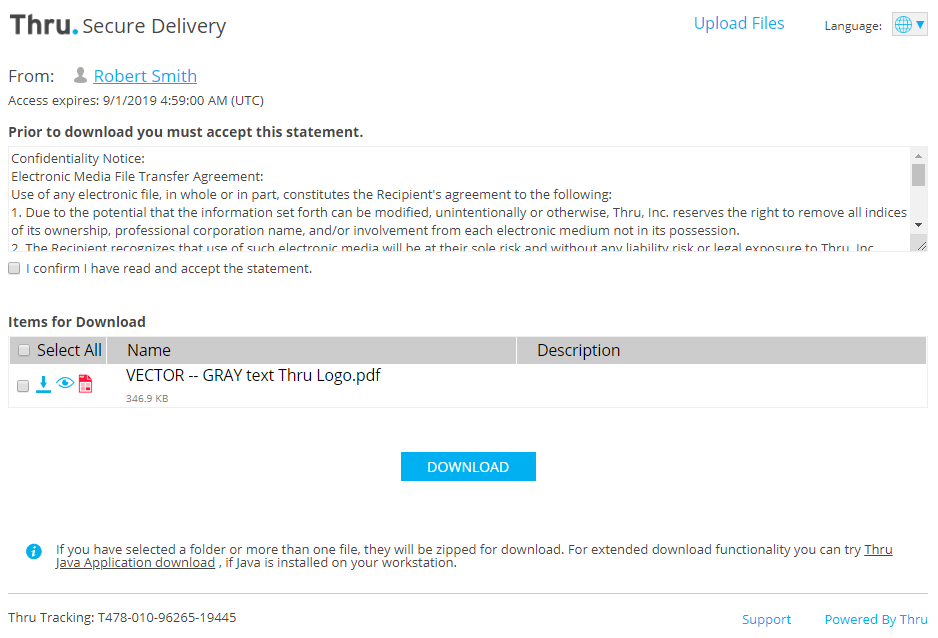 First-time users: If you are downloading files from a sender using the Thru secure file delivery service for the first time, select the New Recipient Registration option.