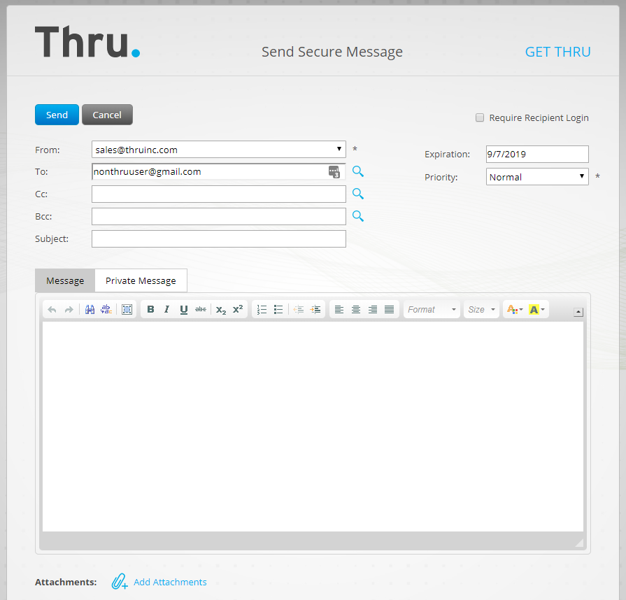 Refer to the following pages for an explanation of the fields in the Thru Secure Message window.