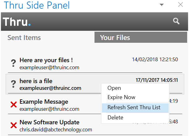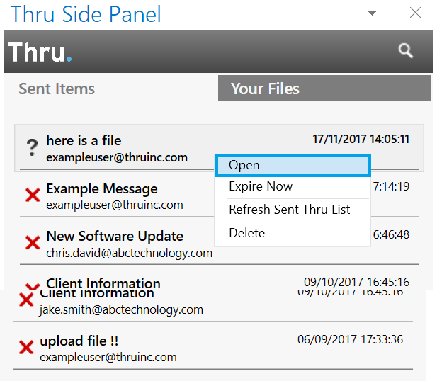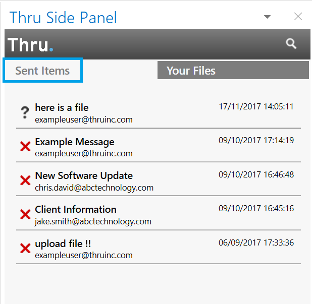 After sending files or folders using the Thru Add-In for Outlook, you can view the message details within the left-hand tab of Thru Side Panel, Sent Items.