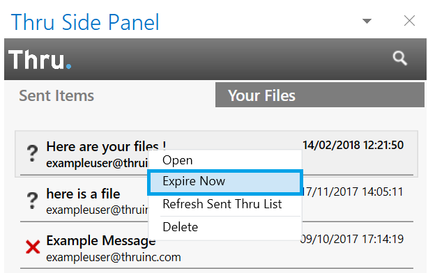 All files and folders sent with Thru have a download expiration date that can be modified at any time. When sent files are expired, they are no longer able to be downloaded by recipients.
