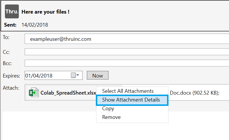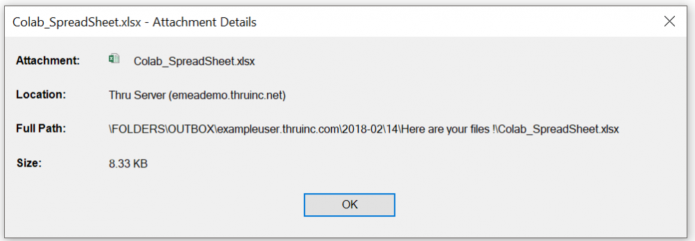 From here, you can view the file name, location, full path on the Thru Server and the attachment size.