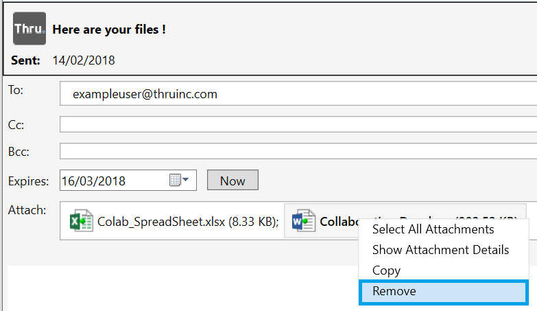 Right-click on any attachment from the Edit Thru message window and click Remove.