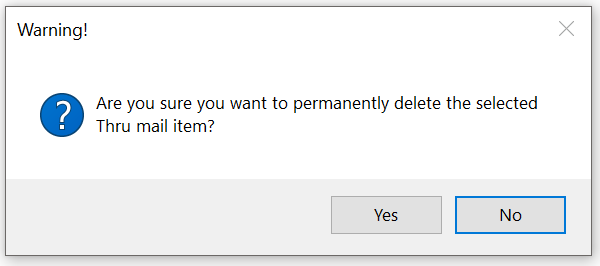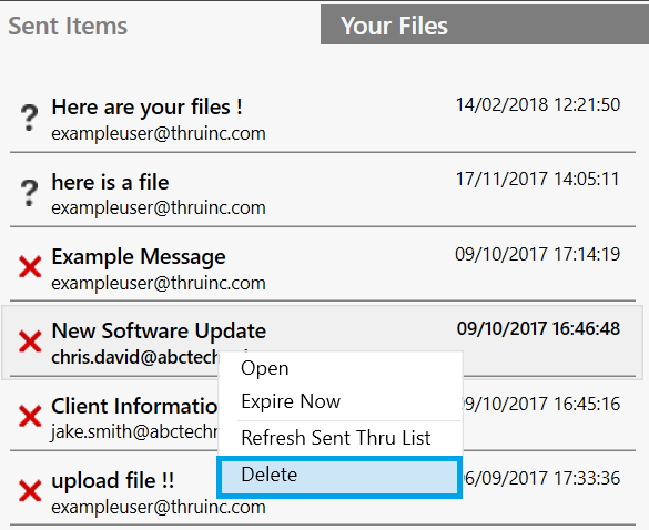 Warning Deleting a message from Sent Items will permanently delete the message and all its attachments from the Thru server. This will cause all files to no longer be downloadable by recipients. You will be asked if you want to permanently delete a message every time you attempt a deletion.