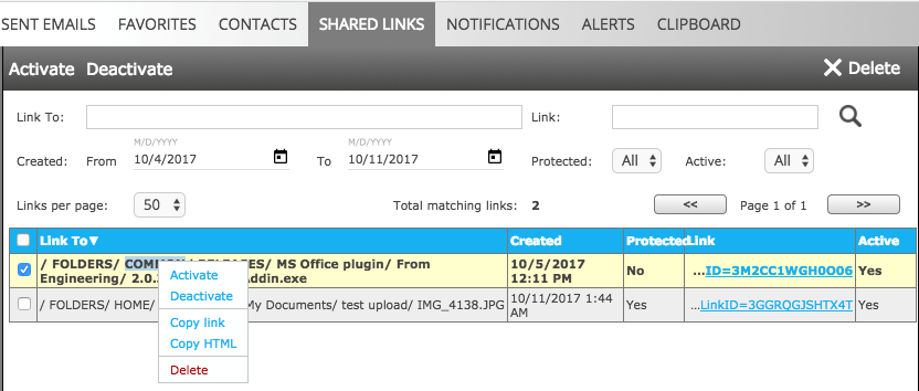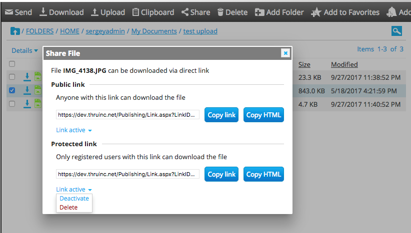 A file can be shared via direct link, with or without authentication. Shared link management is implemented for each user and for administrators.