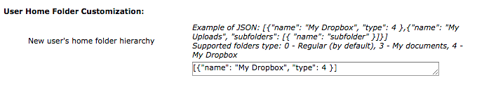 Templates can be set which define a folder layout of a user home folder area for newly created users: subfolders and subfolder trees, a special folder for Thru Dropboxfiles.