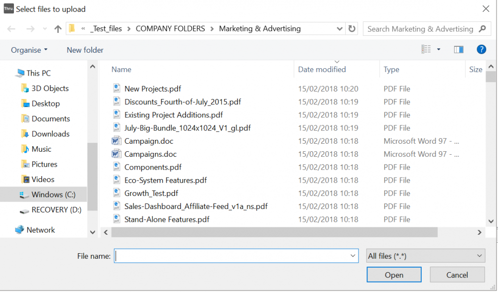 - The Select files to upload window opens. Select the files or folder you want to upload and then click Open.