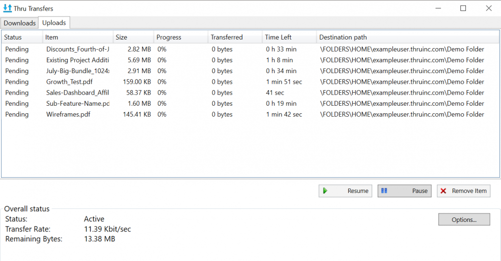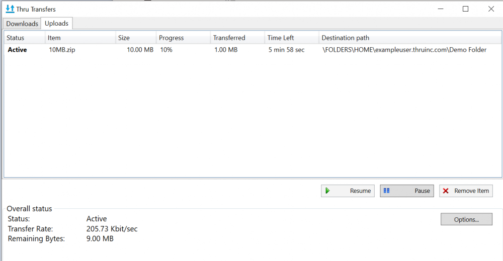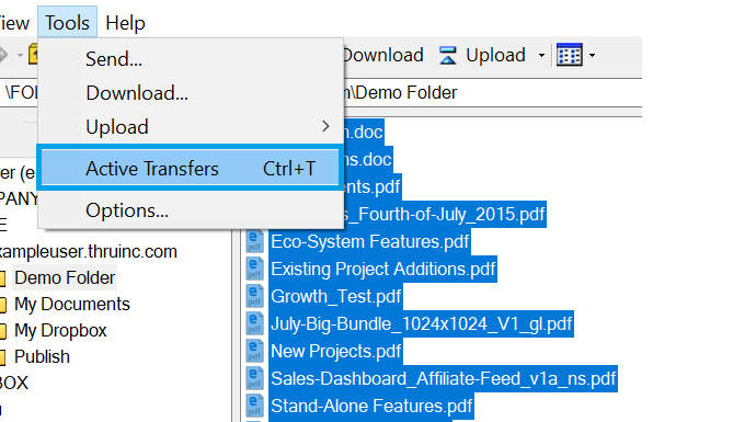 - To view the progress of all Thru file downloads, open the Thru Transfers window by navigating to Tools > Active Transfers.