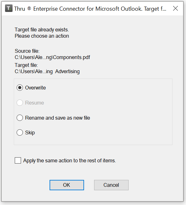 - File already exists: If a file name already exists on your desktop, a window will appear with options to Overwrite, Save with the versioned name, or Skip.