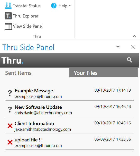 The side panel contains two tabs, Sent Items and Your Files, where users can view transactions sent with their Thru account and navigate their Thru file system.