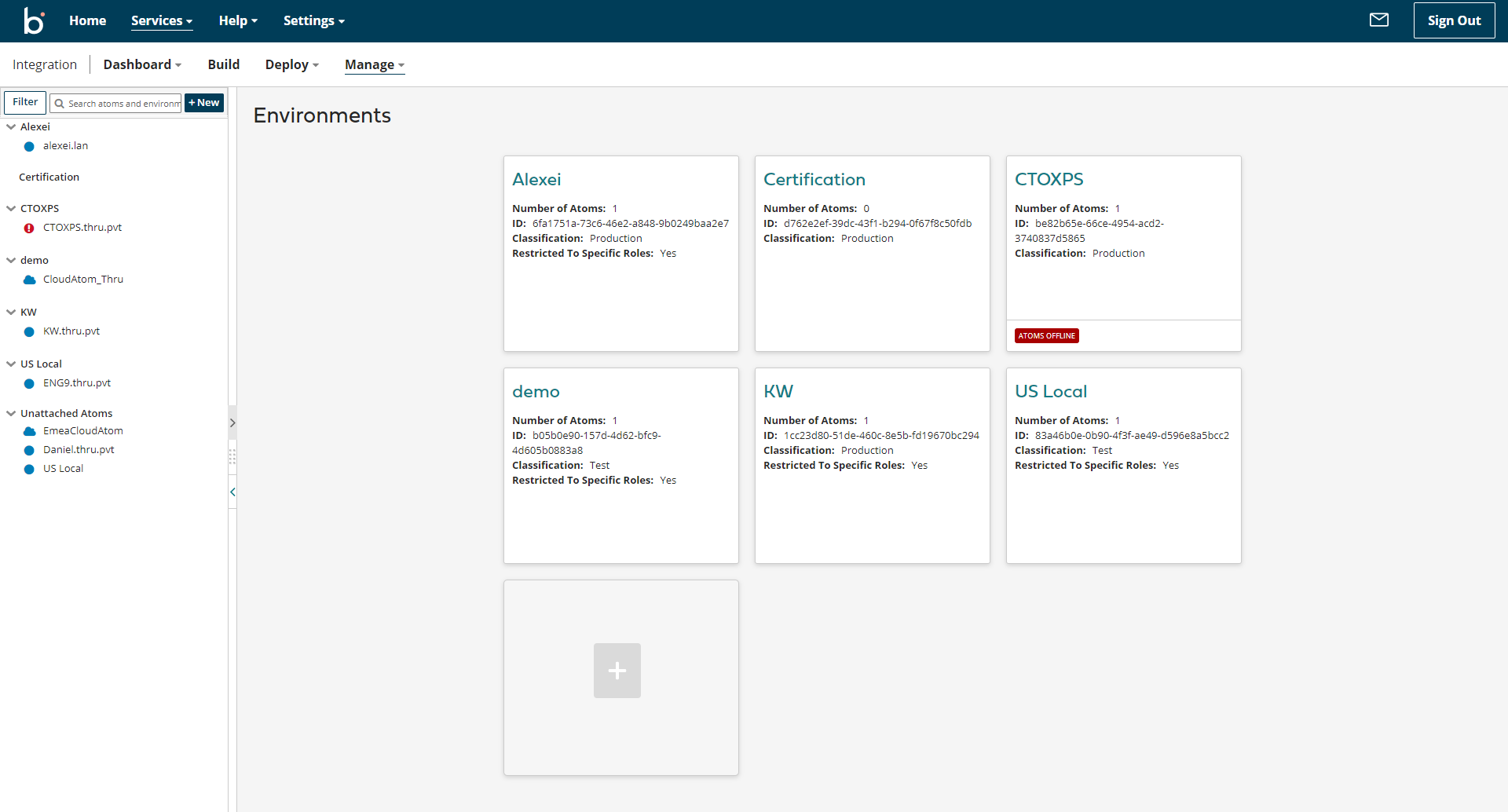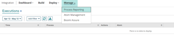 The Manage menu provides a consolidated view of all the integration activity within your account for deployed processes. This includes Atom and Cloud status and historical process execution results. You can view data that has been processed and troubleshoot errors.