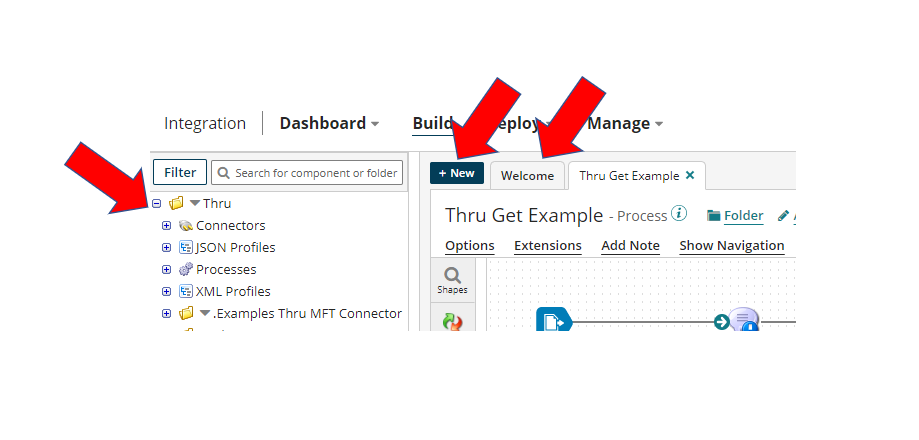 The Welcome tab provides a quick way to open a recent item, create a process, Atom, Molecule, or component, and get help. When you select or create a process, it opens on the process canvas on a new tab and opens the shapes palette. The process canvas is the online tool that supplies the visual interface to build or edit your integration work flow. This is where you construct integrations with the configurable set of components that you link together to form a complete data process.