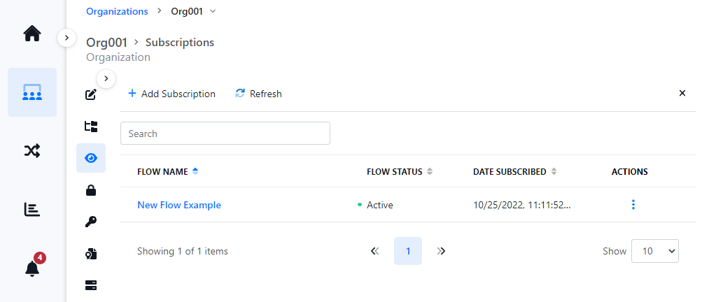 Organization subscriptions to Flows are managed by enterprise administrators or self-managed by Organization administrators via the Thru MFT portal: